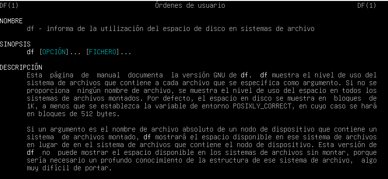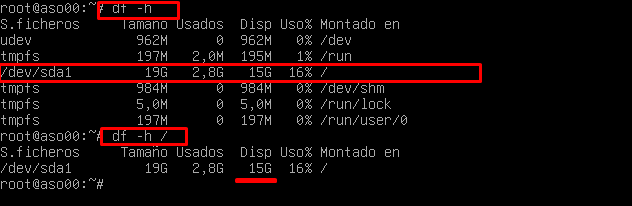 Podemos utilizar la herramienta df para mostrar información de ocupación de los sistemas de ficheros disponibles.