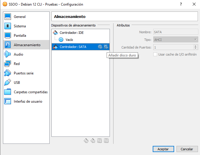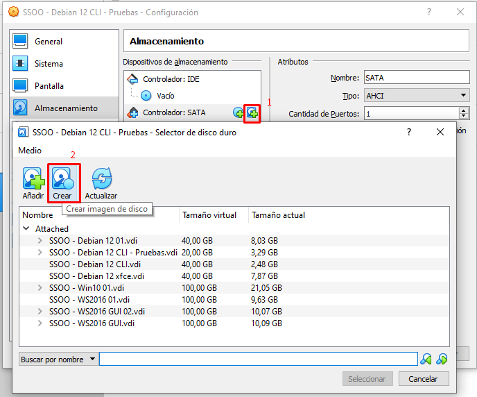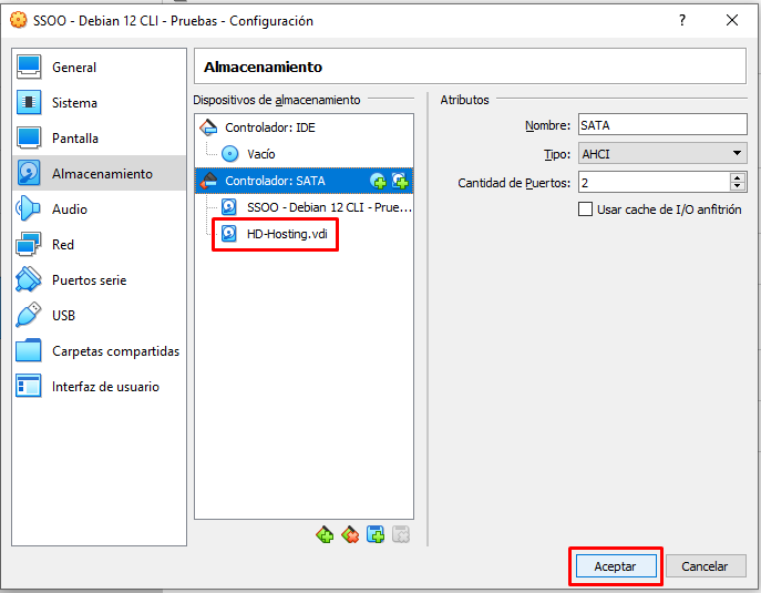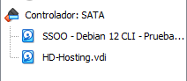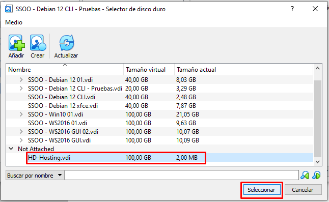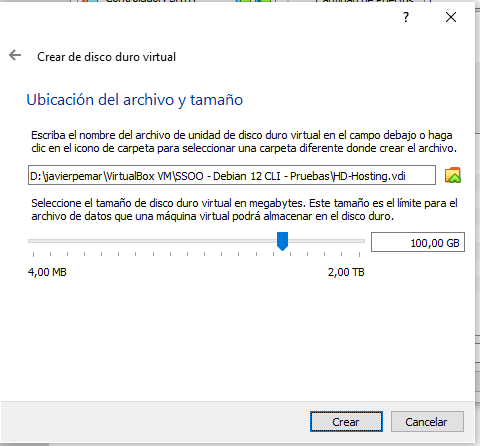 En el contexto de virtualización con el que estamos trabajando esto se reduce a añadir un nuevo disco duro virtual reservado dinámicamente de 100GB que llamaremos HD-Hosting.vdi y almacenaremos en el mismo directorio en el que está almacenada la máquina virtual SSOO – Debian 12 CLI Pruebas