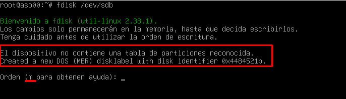 Vamos a editar la tabla de particiones del disco duro /dev/sdb. Para ello le pasamos por parámetro a fdisk el fichero de dispositivo del segundo disco duro SATA: /dev/sdb