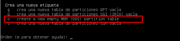 Creamos un nuevo MBR y después crearemos una nueva partición.