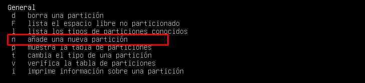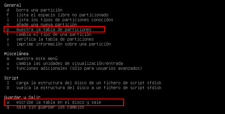 Una vez creada la partición podríamos mostrar la tabla de particiones actual y después salir guardando los cambios. Consultamos la ayuda para ver los comandos