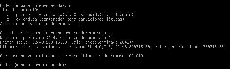 Ahora creamos una nueva partición primaria que ocupará todo el espacio de disco.