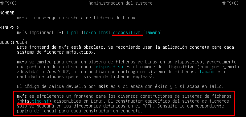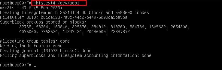 Podríamos utilizar mkfs -t ext4 /dev/sdb1 sin embargo, como sabemos que mkfs llamará al comando mkfs.ext4 lo usaremos directamente.