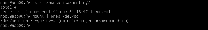 El fichero leeme.txt ya no está. Realmente, si está almacenado en el sistema de ficheros de /dev/sda1, es decir en el sistema de ficheros principal. Al haber montado el nuevo sistema de ficheros en este punto de montaje, no se muestra el contenido del directorio con el mismo nombre en el sistema de ficheros principal.