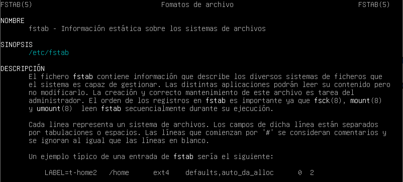 Para configurar nuestro sistema para que monte automáticamente sistemas de ficheros en puntos de montaje durante el arranque utilizaremos el fichero /etc/fstab. Podemos consultar la página de manual de fstab para conocer más sobre el fichero.