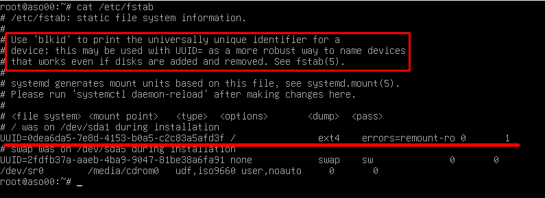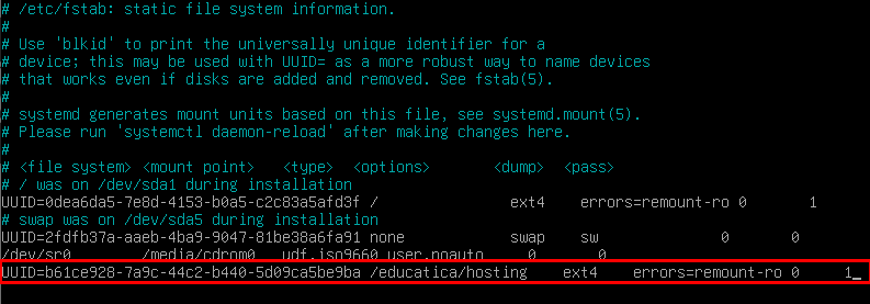 Tenemos que utilizar blkid para obtener el UUID del sistema de ficheros que queramos montar, después indicamos la ruta del punto de montaje seguida del tipo de sistema de ficheros y de opciones.