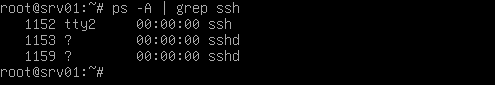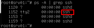 Vamos a la terminal virtual número 1, que estamos con el usuario root, y vamos a ver qué procesos del sistema están ejecutando ssh o algo parecido, es decir cuyo nombre comience por ssh.