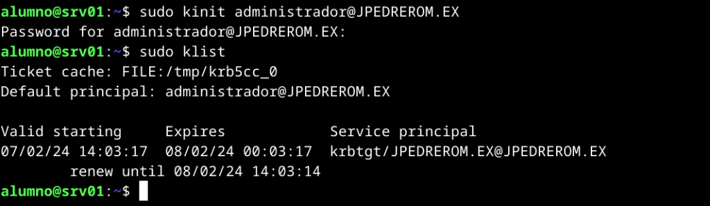Ejecutamos el comando kinit para obtener un «ticket» para unirnos al dominio