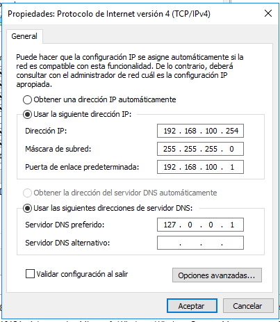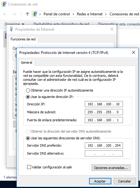 Vamos a ver la configuración de red de WS2016. La dirección IP del servidor es 192.168.100.254/24.