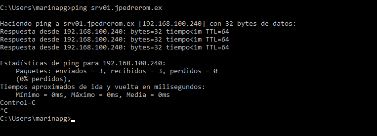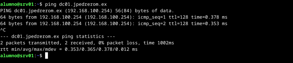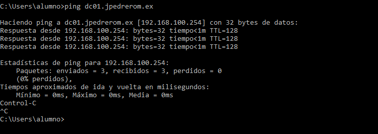 Para comprobar que todo ha ido bien, vamos a utilizar el comando ping, pero en lugar de usar la dirección IP del controlador de dominio vamos a usar su FQDN. De esta forma, si ping funciona, comprobamos tanto la conexión al equipo a través de la red como la resolución de nombres DNS.