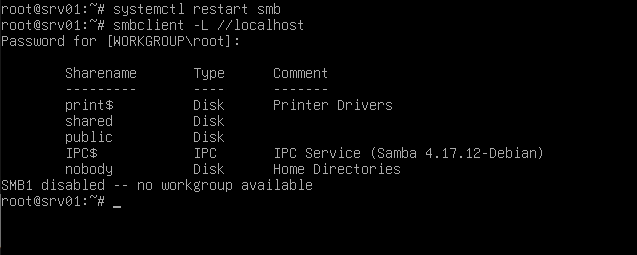 Reiniciamos y comprobamos los recursos compartidos disponibles en el sistema.