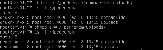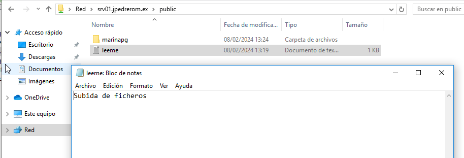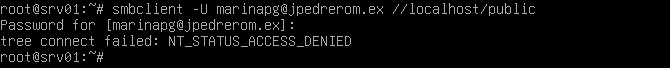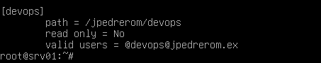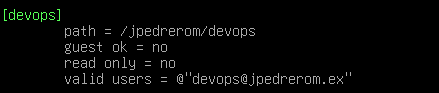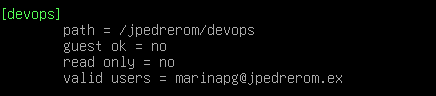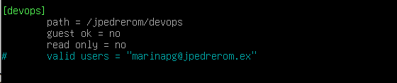 - public. Compartirá el directorio /jpedrerom/uploads para que cualquier usuario del dominio con cuenta en samba pueda acceder para lectura y escritura. No se permiten invitados.