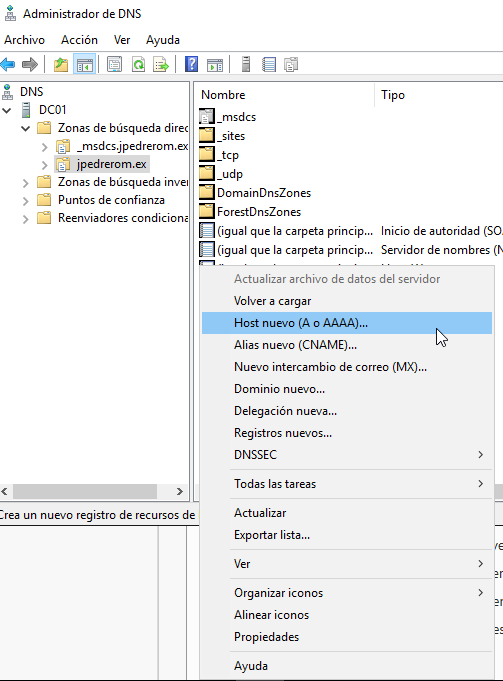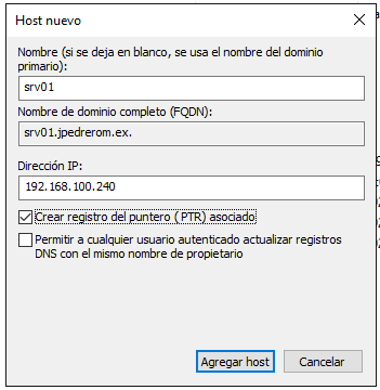 Añadiendo entrada para el servidor srv01 en el servidor DNS