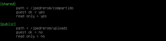 - shared. Compartirá el directorio /jpedrerom/compartido para que cualquier usuario (invitados también) pueda acceder para lectura.