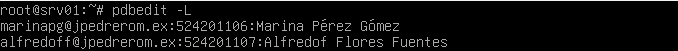 Vamos a mostrar información de la base de datos de usuarios de samba con pdbedit -L