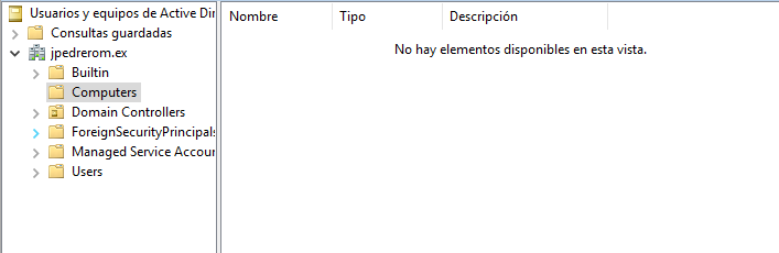 Antes de comenzar el proceso, vamos a echar un vistazo a Usuarios y equipos de Active Directory en el controlador de dominio para comprobar que no hay ningún equipo todavía.