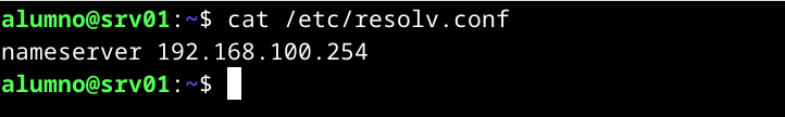 Vamos a configurar el cliente DNS de nuestro sistema Debian para que utilice el servidor DNS de la organización cuya dirección IP es la del controlador de dominio, que será 192.168.100.254. Para ello, editamos el fichero /etc/resolv.conf.
