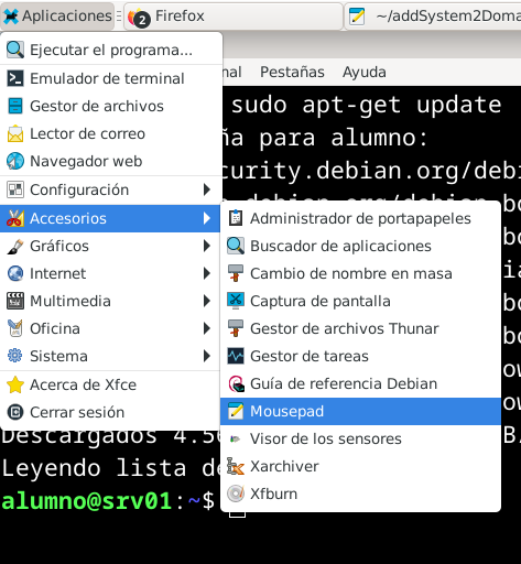 Ahora vamos a hacer uso del editor de textos mousepad en nuestro equipo de escritorio para ir tomando nota de los pasos que vamos dando para unir el equipo al dominio.