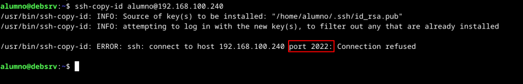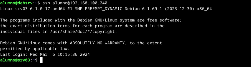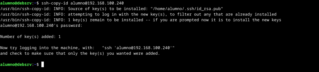 Ya hemos copiado la clave pública y podremos iniciar sesión remota con alumno@192.168.100.240 sin insertar contraseña una y otra vez.
