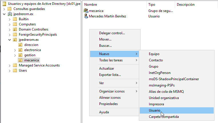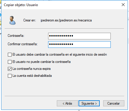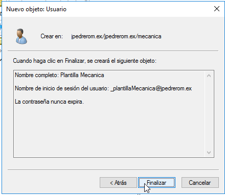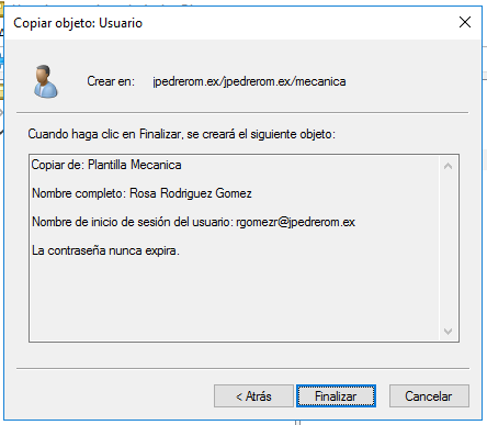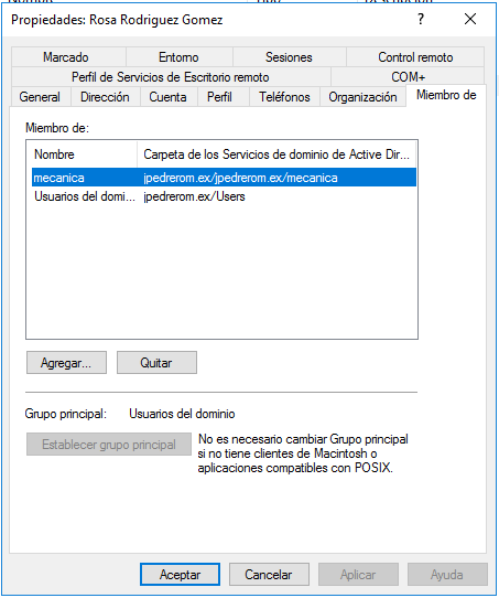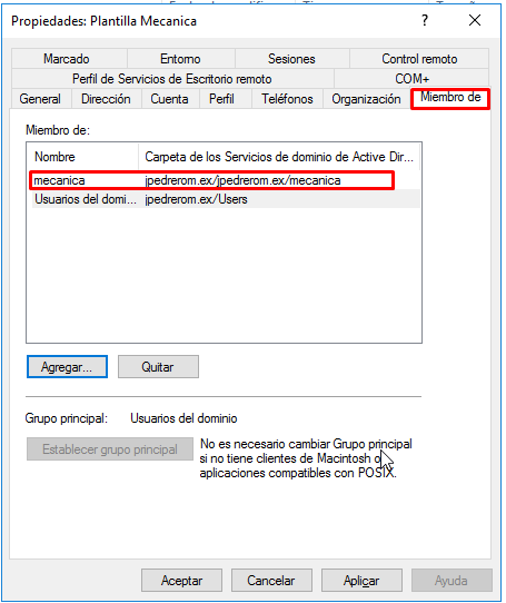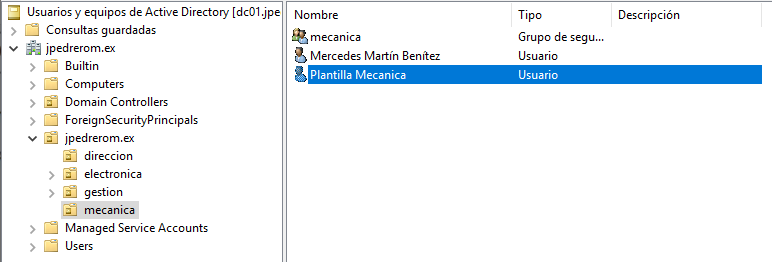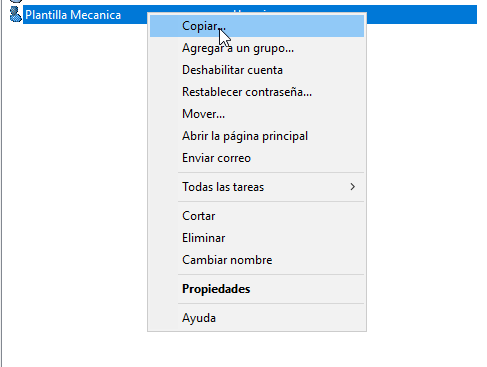 Ya tenemos la cuenta de usuario plantilla para el grupo de usuarios de mecanica, pero todavía no la hemos configurado. Solo hemos creado la cuenta de usuario. La configuramos accediendo a propiedades.
