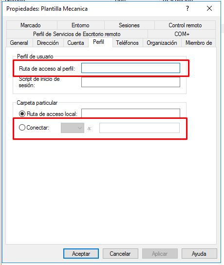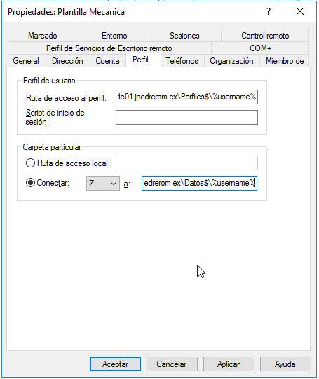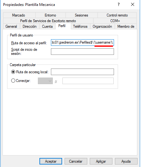 Vamos a utilizar la variable de entorno username para que cuando copiemos este usuario plantilla en otros nuevos usuarios, automáticamente esta ruta apunte al directorio perfil del usuario nuevo, no al de la plantilla.