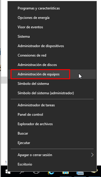 Accedemos a administración de equipos desde el menú contextual que podemos lanzar haciendo clic con el botón secundario sobre el botón de inicio de Windows.
