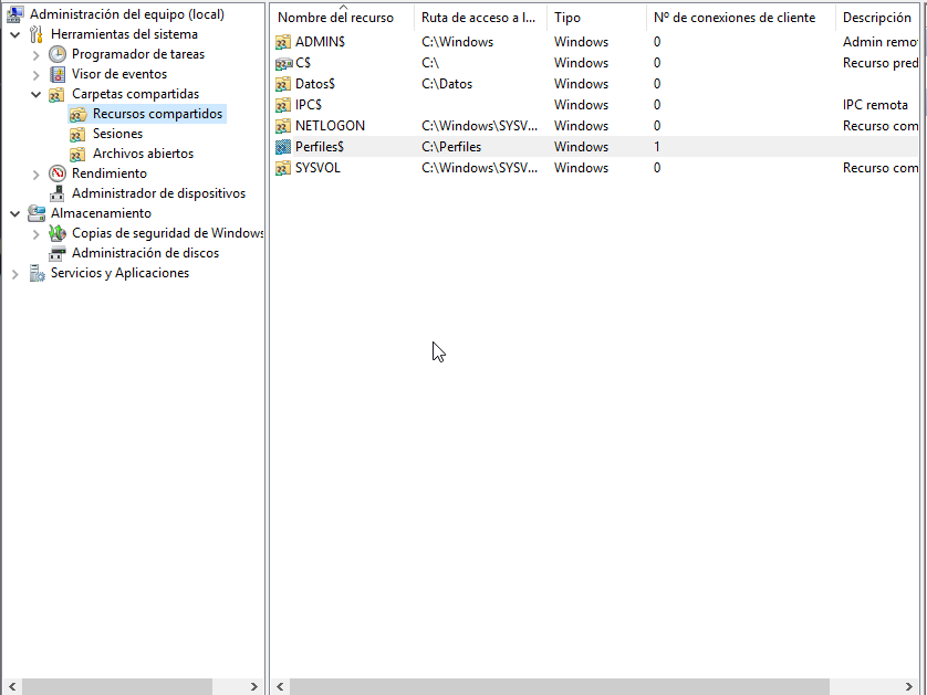Desde la herramienta de recursos compartidos podemos gestionar todos los recursos compartidos en este sistema.
