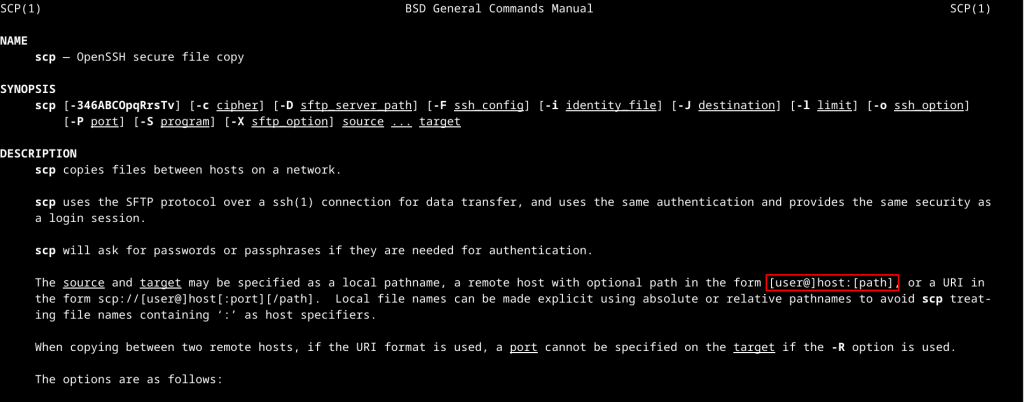 También podemos consultar la página de manual de scp para echar un vistazo rápido a la sintaxis y profundizar en la configuración si lo necesitamos.