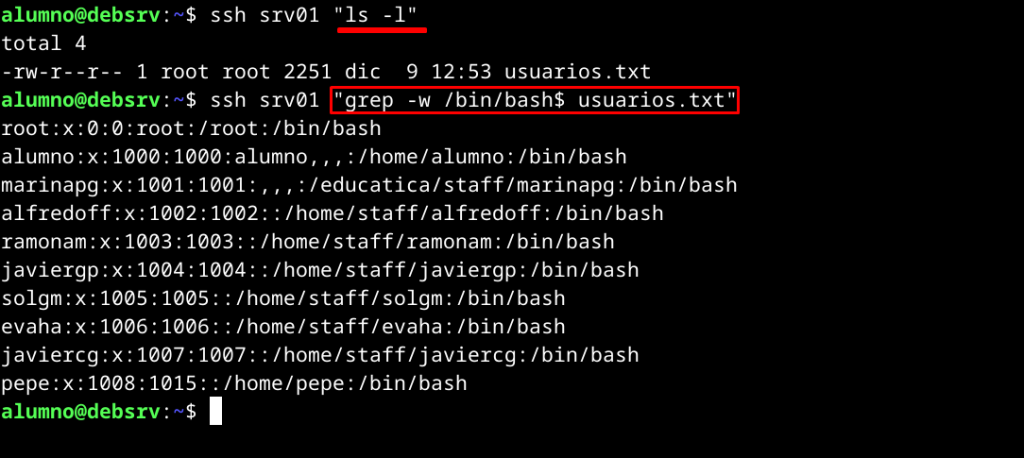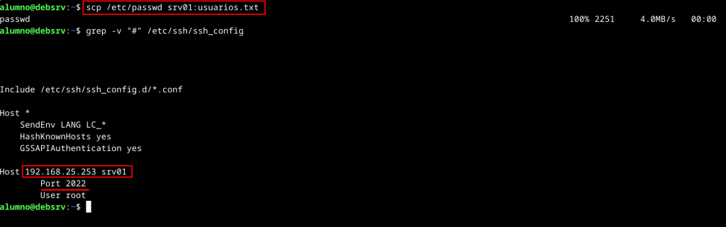 Por tanto el origen será el fichero /etc/passwd en el sistema debsrv y el destino será el directorio actual srv01 con el nombre de fichero usuarios.txt