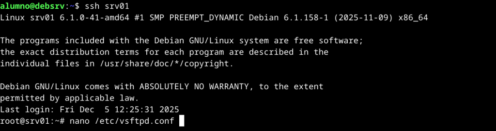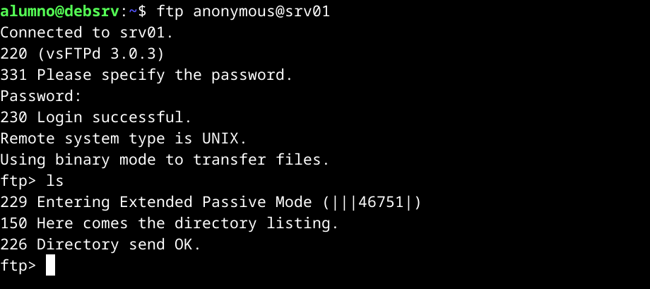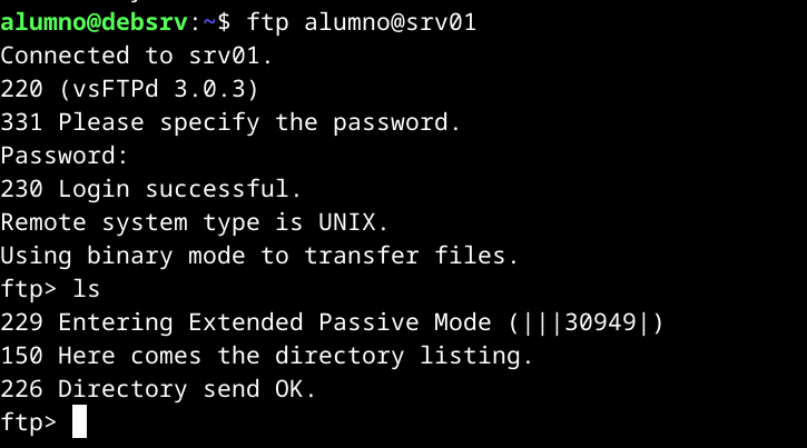 Una vez instalados los paquetes de software nos piden que probemos que todo funciona, así que utilizaremos aplicaciones clientes en debsrv para comprobar los servicios proporcionados en el servidor srv01.