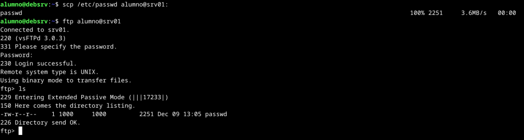 - Vamos a copiar el fichero /etc/passwd de la máquina debsrv a la máquina srv01 con el nombre de fichero usuarios.txt. Si tienes dudas con scp puedes consultar la página de manual o la entrada de www.educatica.es sobre scp: Copiando ficheros de forma segura con scp .