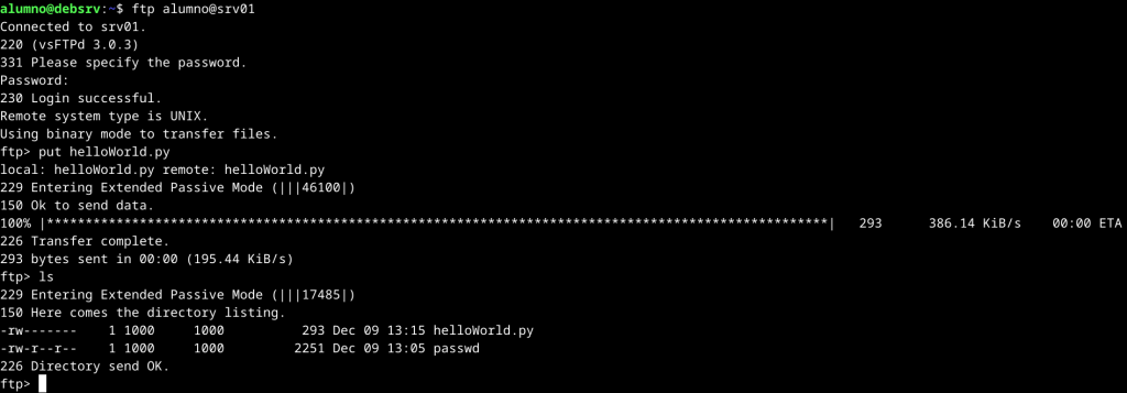 Hemos iniciado sesión a través de ftp en srv01 con el usuario alumno (alumno@srv01). Sin embargo, al hacer ls no se muestra el fichero que hemos subido antes. ¿por qué?