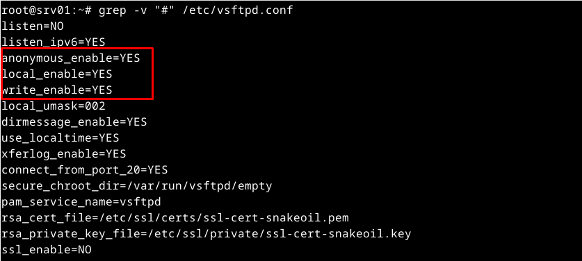 El fichero de configuración de este servicio está en /etc/vsftpd.conf. Muestra el contenido de dicho fichero sin comentarios y sin líneas vacías, por favor.