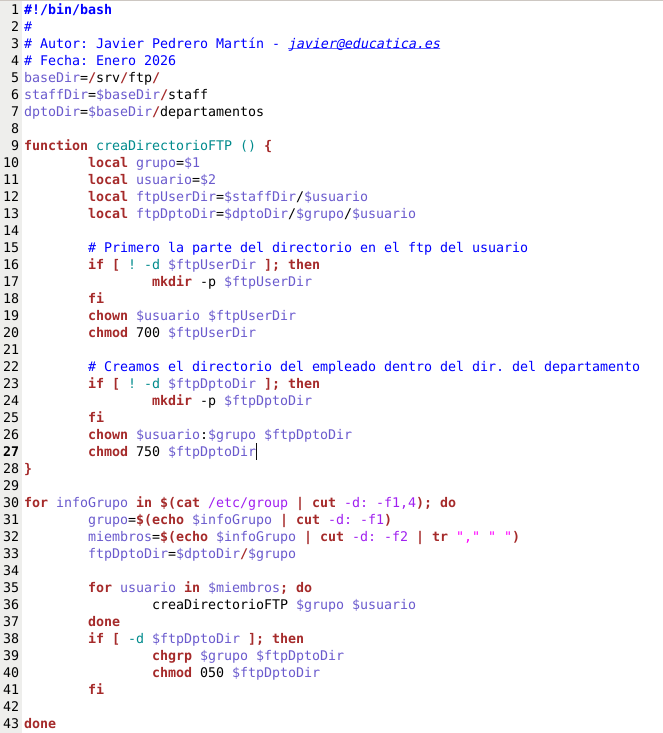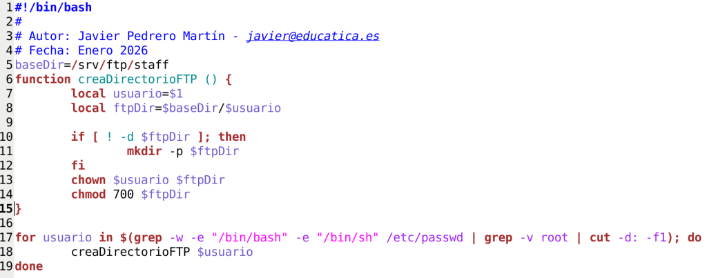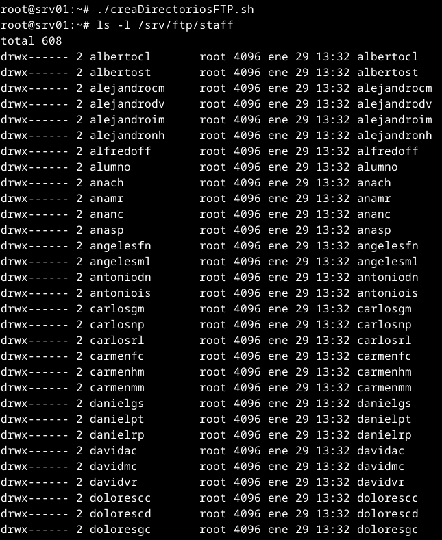 Recorremos la lista de usuarios del fichero /etc/passwd y, para cada usuario del sistema, si no existe su directorio de usuario en /srv/ftp/staff, lo creamos y lo configuramos para que ese usuario sea el único que pueda acceder con todos los permisos.