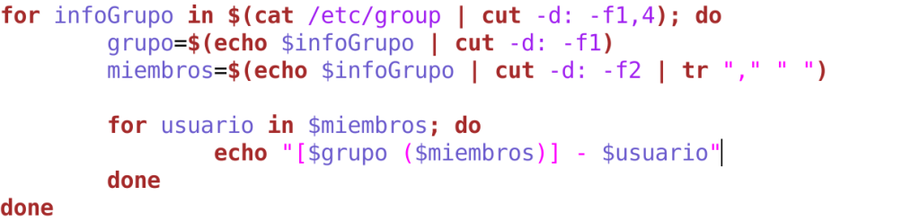 Recorremos los grupos del fichero de grupos del sistema obteniendo el nombre del grupo y la lista de miembros.