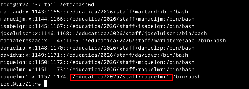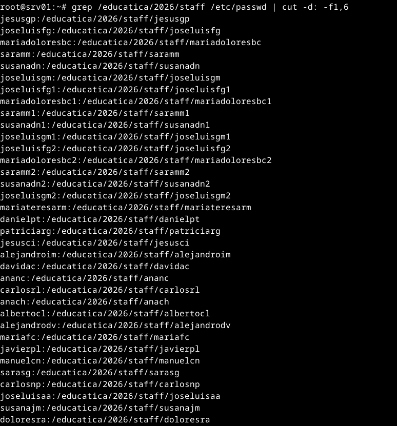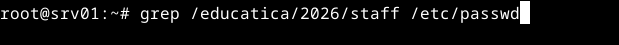 ¿Cómo mostrarías las líneas del fichero de cuentas de usuario que sean de usuarios que tengan su directorio personal dentro del directorio /educatica/2026/staff?