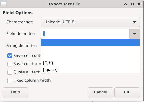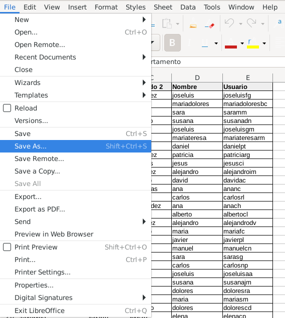 Pero esta solución es un poco complicada. Es muuuuuuuuucho más sencillo abrir el fichero ods con LibreOffice Calc y guardarlo en formato CSV (Coma Separated Values).