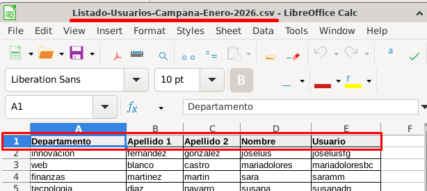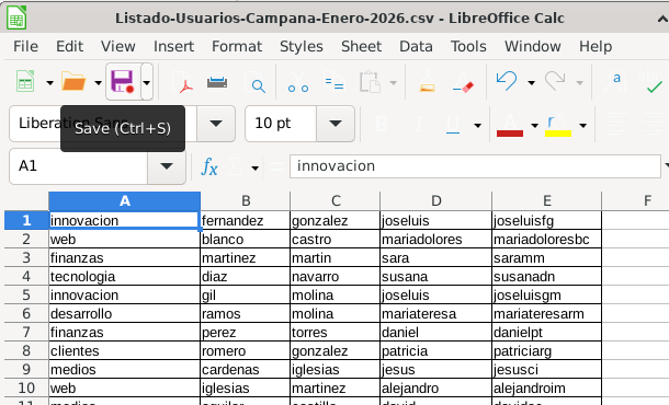 Ya tenemos el fichero como .csv, aunque libreoffice nos lo muestre con formato de hoja de cálculo. Nos damos cuenta de que nos sobra la primera fila así que podemos eliminarla.
