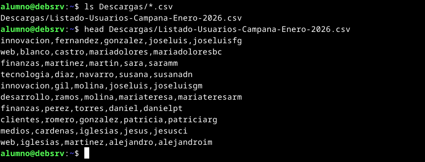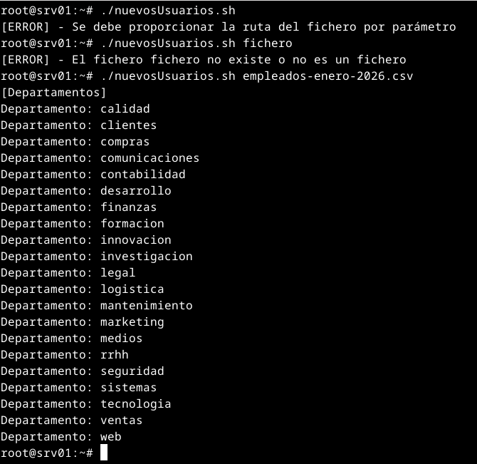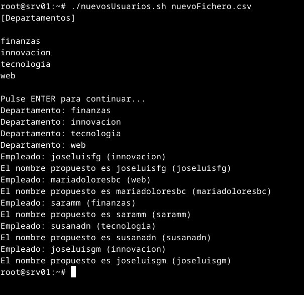Este script deberá crear una cuenta de usuario para cada empleado proporcionado. El nombre de la cuenta de usuario se facilita en el propio fichero, lo único que habría que comprobar es que no exista ya una cuenta de usuario con el mismo nombre. Si esto sucediera habría que añadir al nombre un número en secuencia que comience por el 1 e iría aumentando en caso de que siguiera existiendo un usuario con ese nombre, incluido el nombre, hasta que no haya coincidencias.