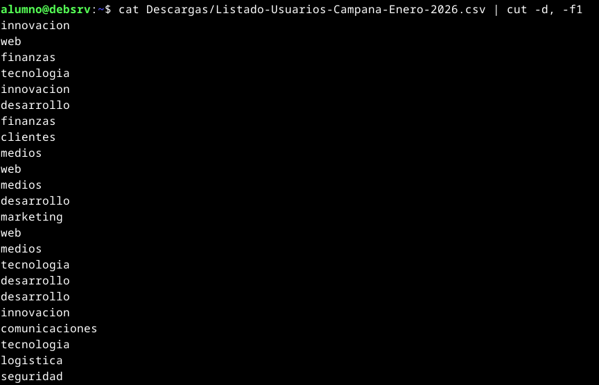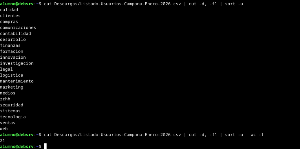 A ver si eres capaz de mostrar en pantalla solo los departamentos eliminando las repeticiones con comandos usando tuberías.
