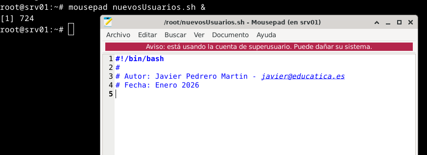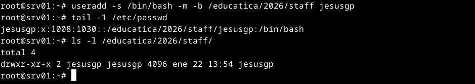 Crearemos una cuenta de usuario para el usuario, asignándole como contraseña ClaveRoot#20, como shell /bin/bash y el directorio personal lo almacenaremos en /educatica/2026/staff con el nombre de la cuenta de usuario.