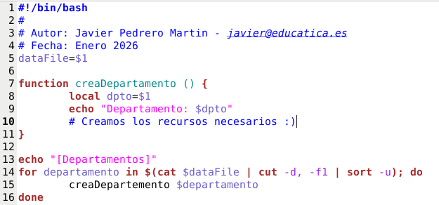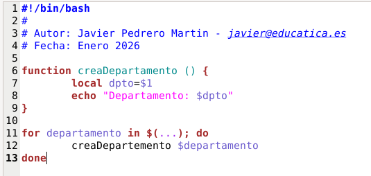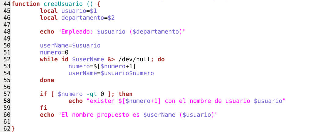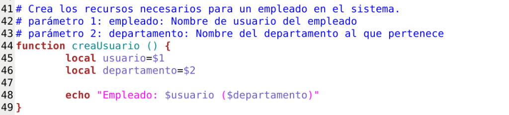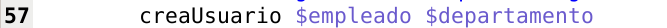 Una vez tengamos esta parte resuelta, podemos sustituir la línea con el echo con una llamada a una función que llamaremos creaUsuario $empleado $departamento