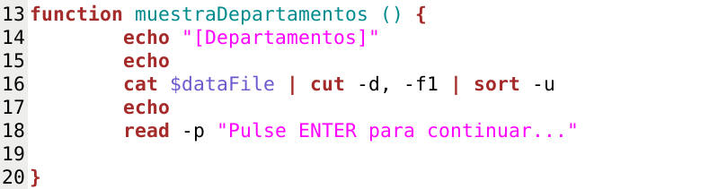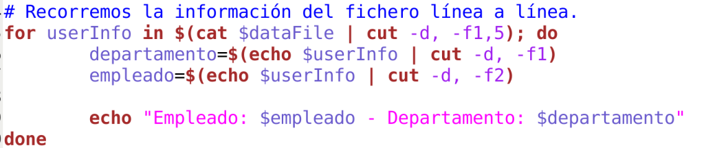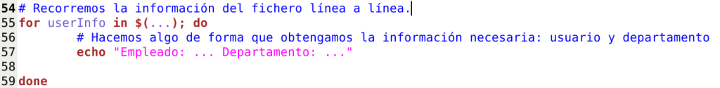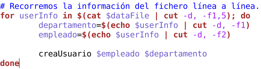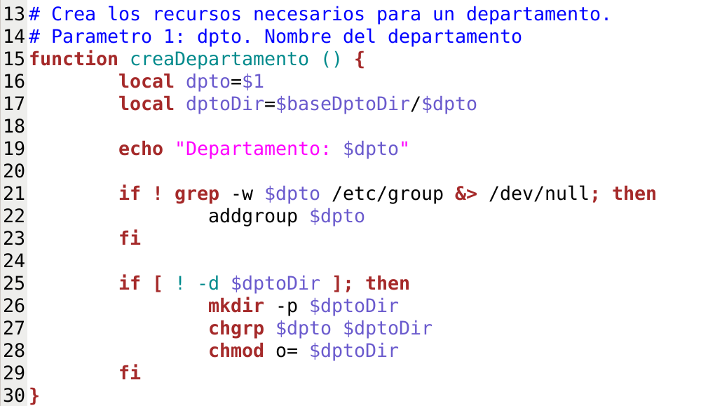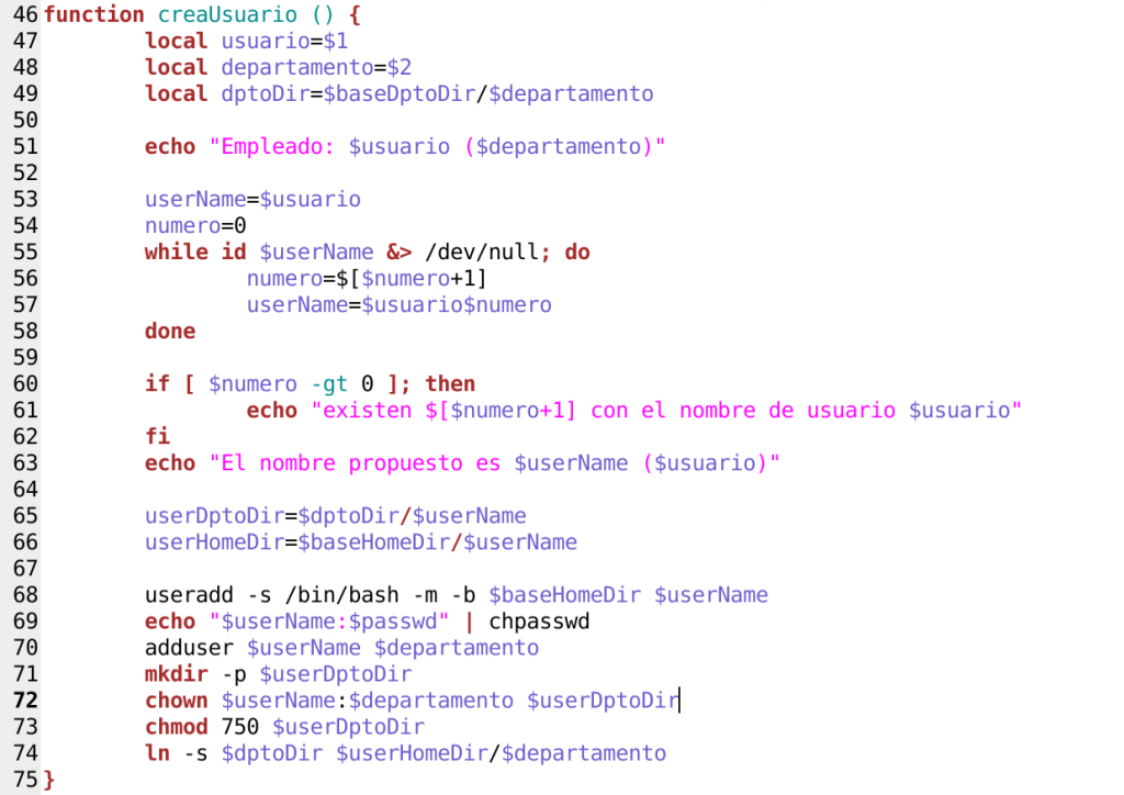 Ahora solo hay que meterlo en la función. Nos queda cambiar la contraseña, crear el directorio del empleado en el departamento, añadir el usuario como miembro del departamento, crear un enlace simbólico.