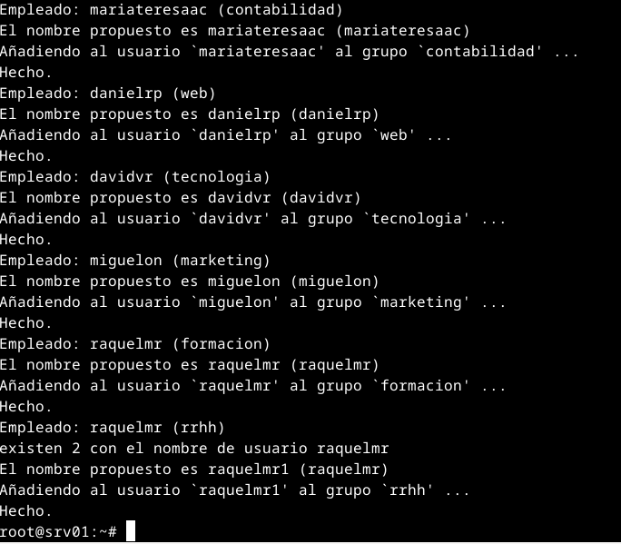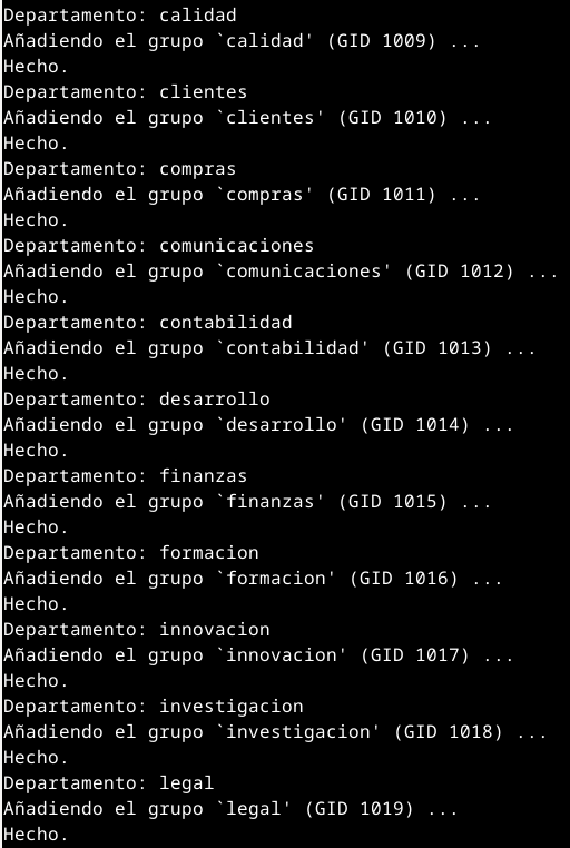 Ahora nos tocaría trabajar con los empleados para crear los recursos necesarios para cada empleado en el sistema: cuenta de usuario, añadir cuenta de usuario como miembro del grupo del departamento, crear y configurar directorio del empleado y crear enlace simbólico.