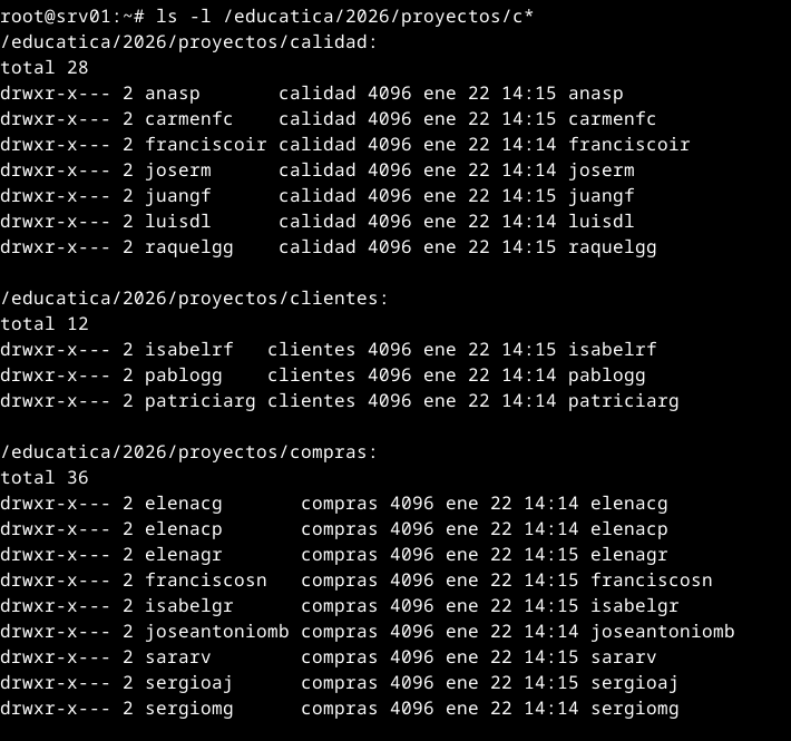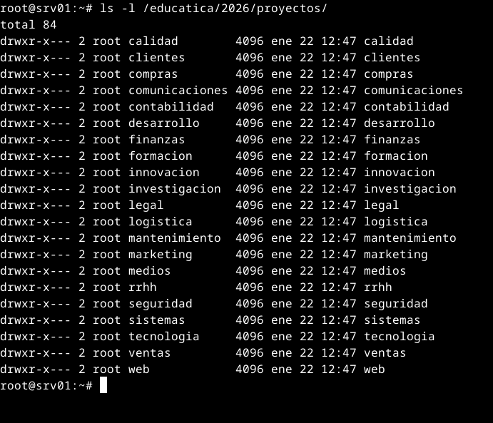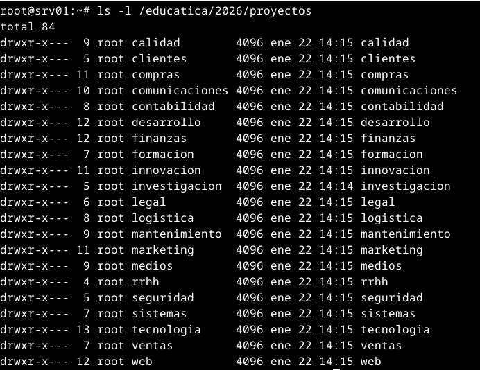 Para cada departamento crearemos una cuenta de grupo si no existe en el sistema y un directorio del departamento que tendrá el nombre del departamento y estará almacenado en /educatica/2026/proyectos. Al directorio del departamento tan solo podrán acceder con permisos de lectura los miembros del departamento.