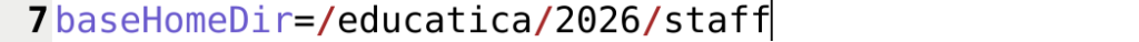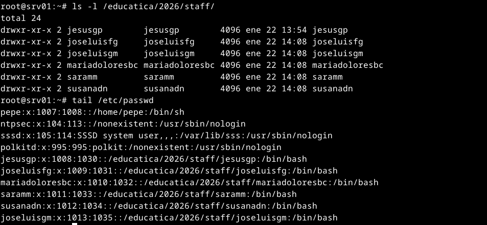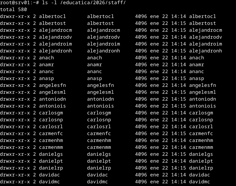 Entonces, lo primero que tenemos que tener claro es que el directorio /educatica/2026/staff tiene que existir y tener una configuración 755 root root, por seguridad el caso del propietario, pero sobre todo asegurar que los usuarios pueden acceder.