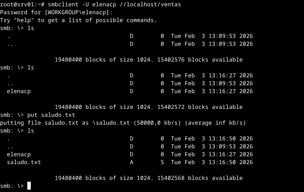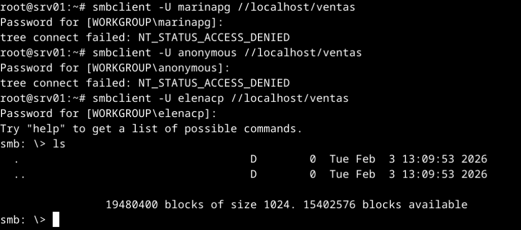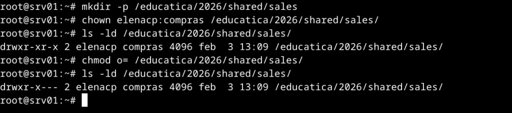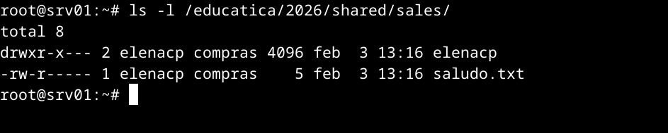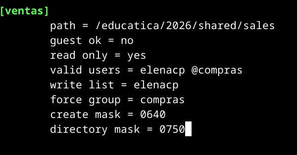 • ventas. Directorio: /educatica/2026/shared/sales. Tan solo podrán acceder a través de Samba para realizar operaciones de lectura los miembros del grupo compras, pudiendo acceder para realizar operaciones de lectura y escritura el usuario elenacp. El resto de usuarios no podrá realizar ninguna operación. Configura el recurso de forma que cuando se suban ficheros o creen directorios se garantice que el grupo compras podrá leer y el usuario elenacp pueda realizar operaciones de lectura y escritura.
