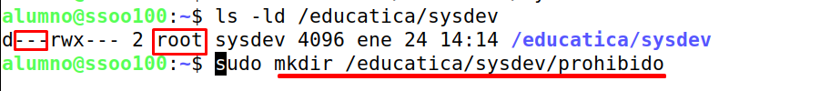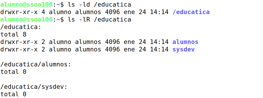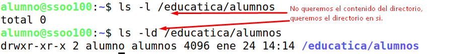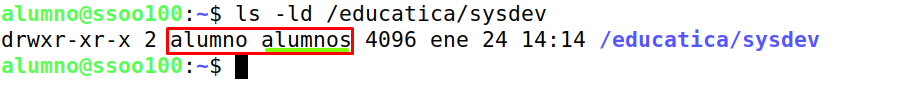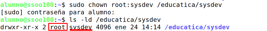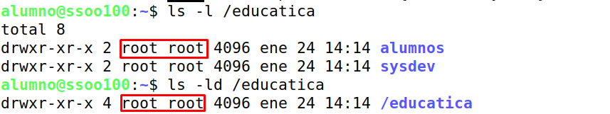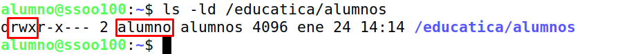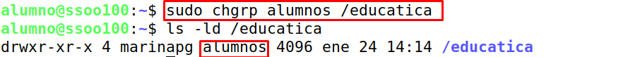 82. Cambia el propietario y el grupo del directorio /educatica y todo su contenido de forma que el nuevo propietario sea alumno y el grupo sea alumnos.