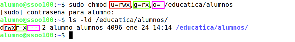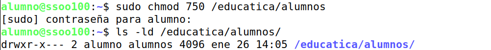 84. Configura el directorio /educatica/alumnos de forma que el propietario tenga todos los permisos, los miembros del grupo tan solo puedan acceder para leer y el resto de usuarios del sistema no puedan realizar ninguna operación.