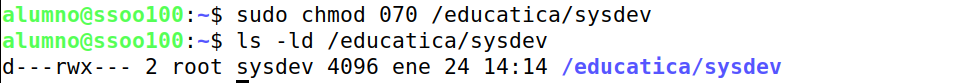 85. Configura el directorio /educatica/sysdev de forma que solo los miembros del grupo sysdev puedan acceder para realizar operaciones de lectura y escritura.
